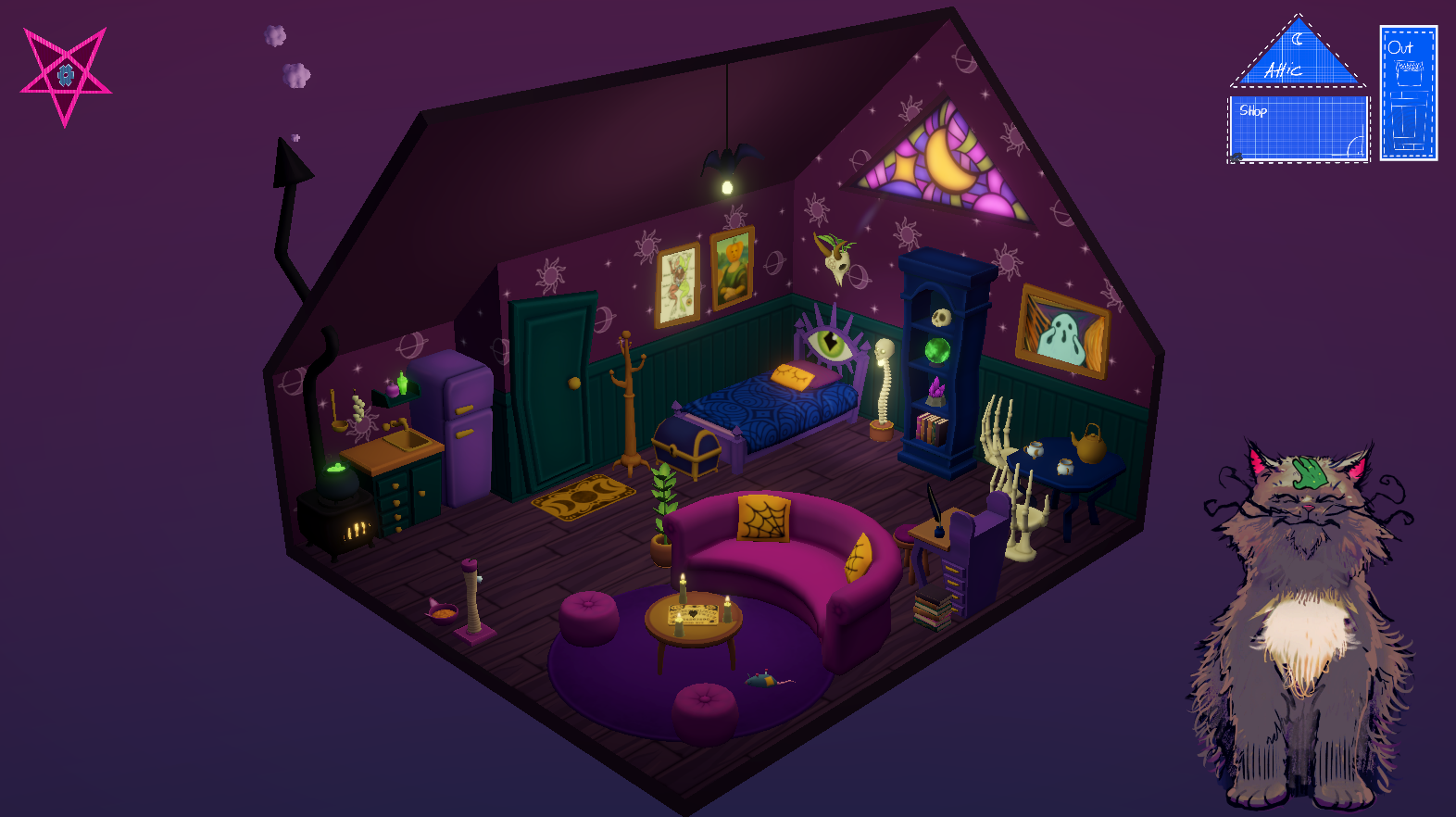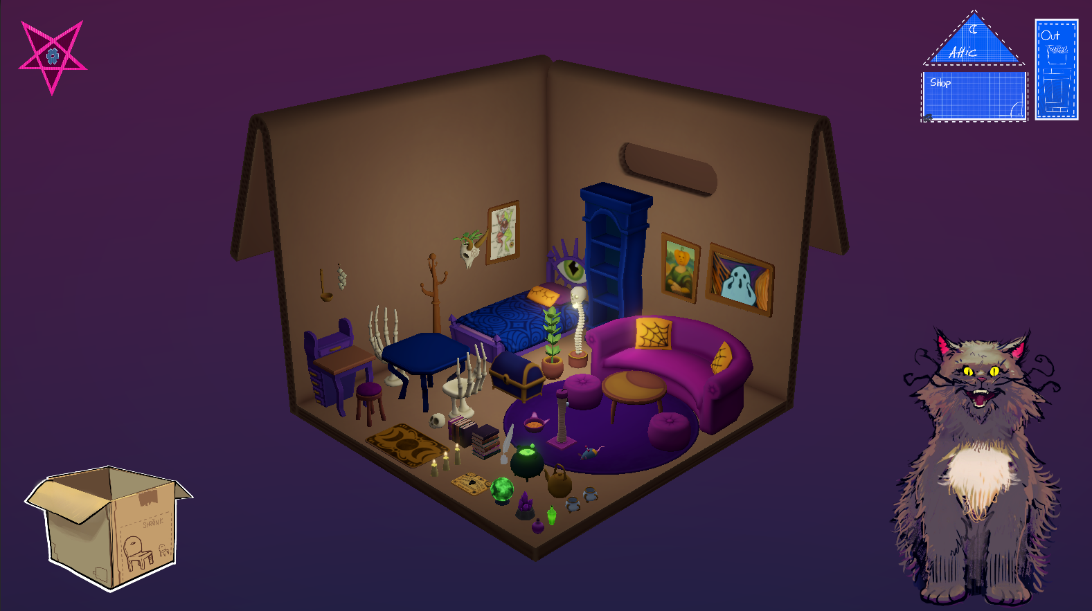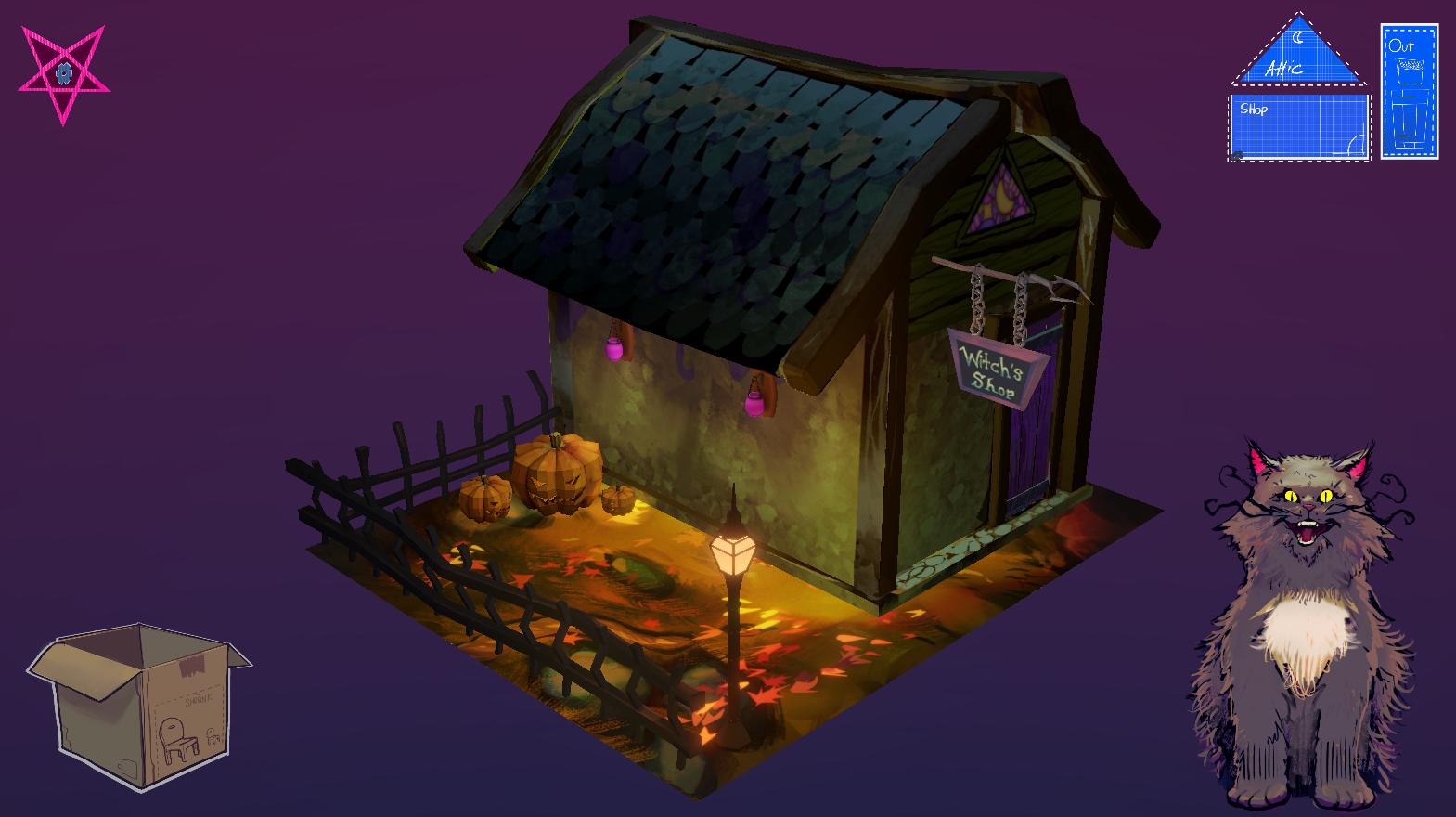 It's a fresh start at a new town for this Witch! Set up a magic shop: unpack moving boxes and decorate with all things creepy and cozy - in the company of your new (and rather fluffy) landlord...